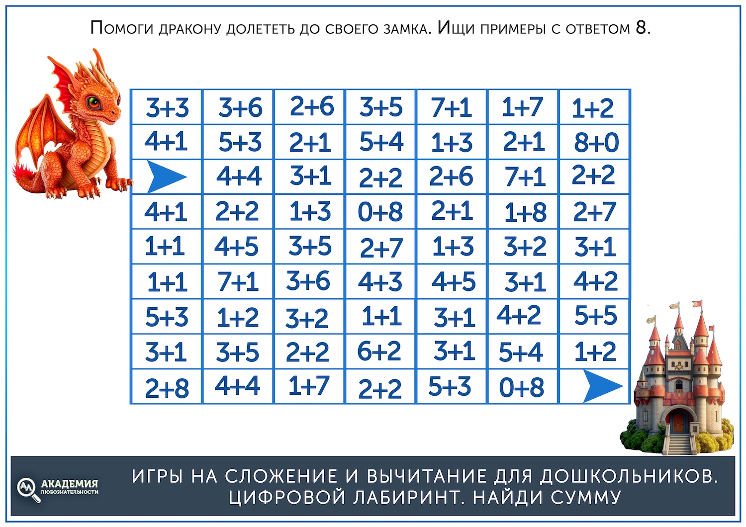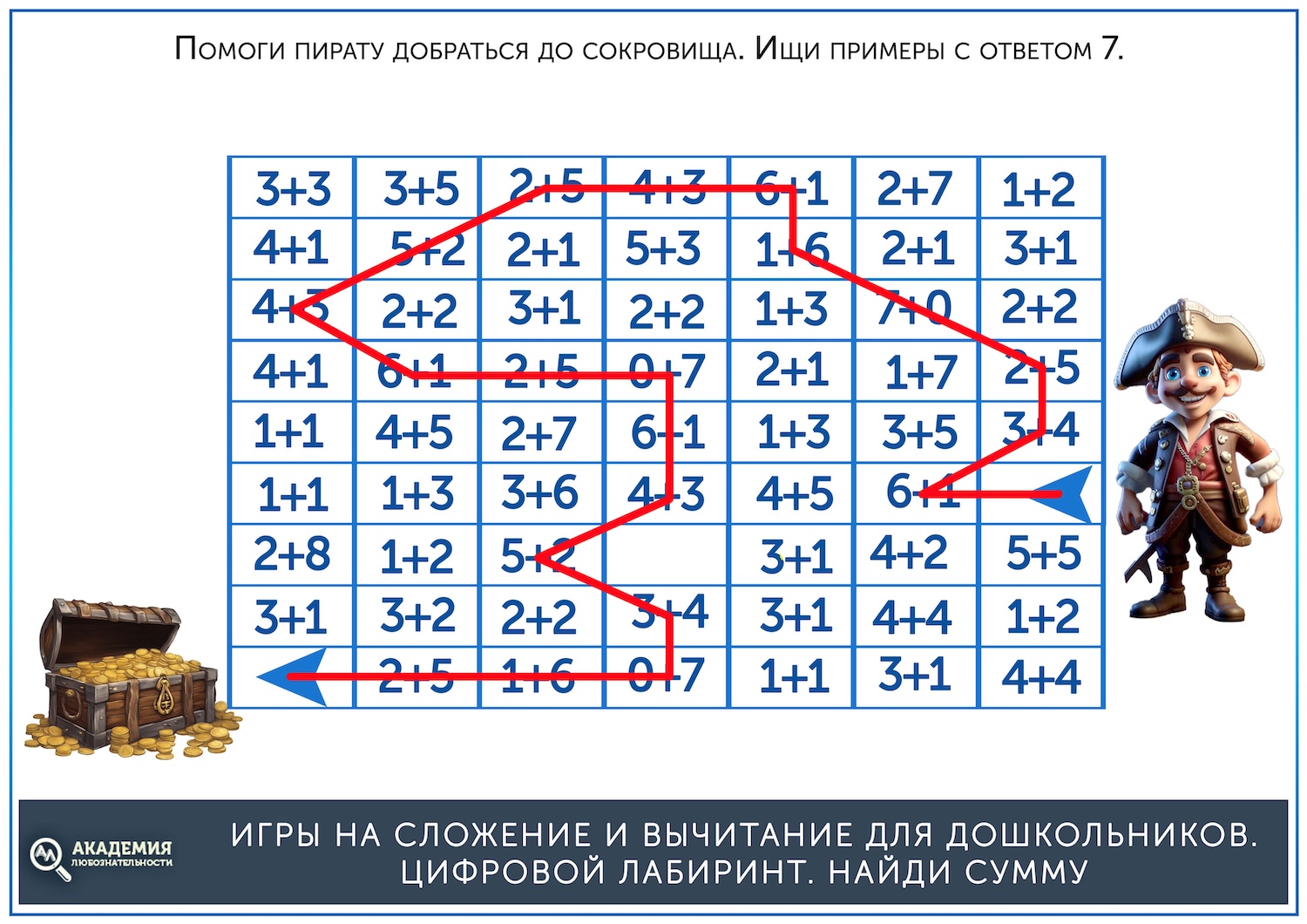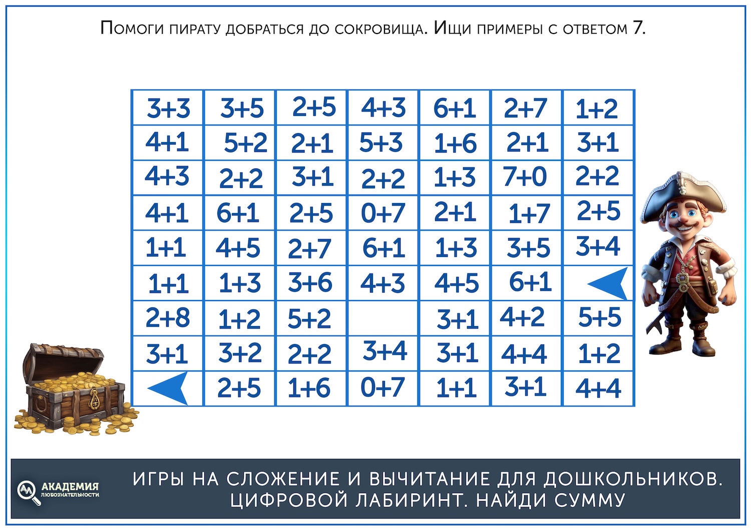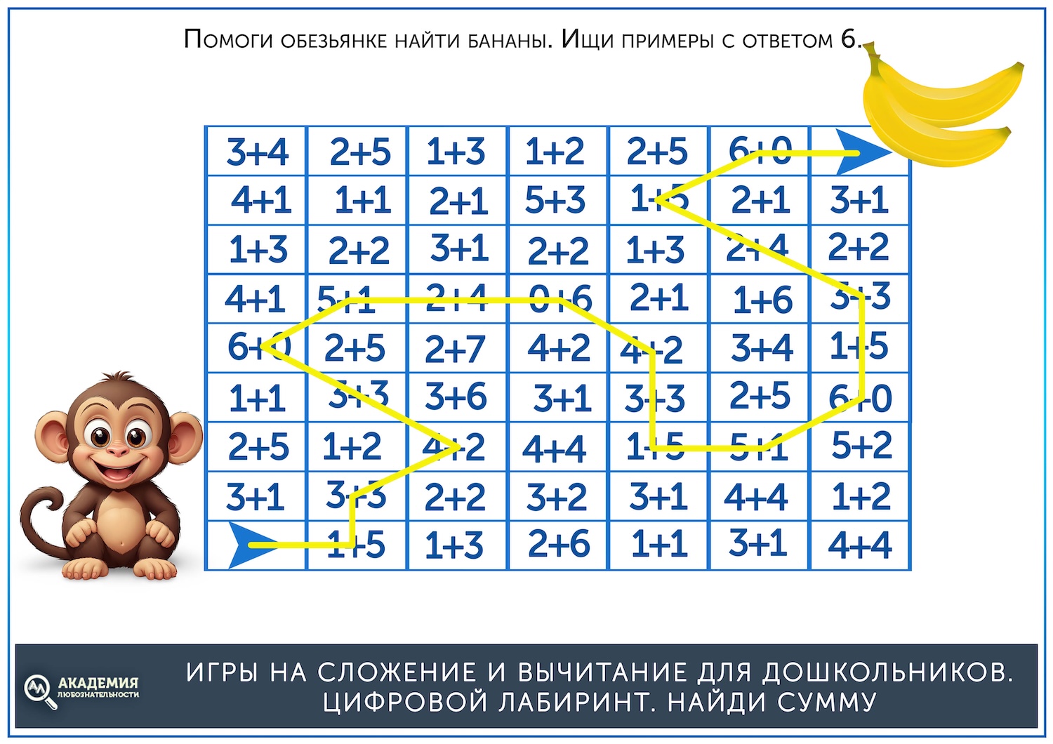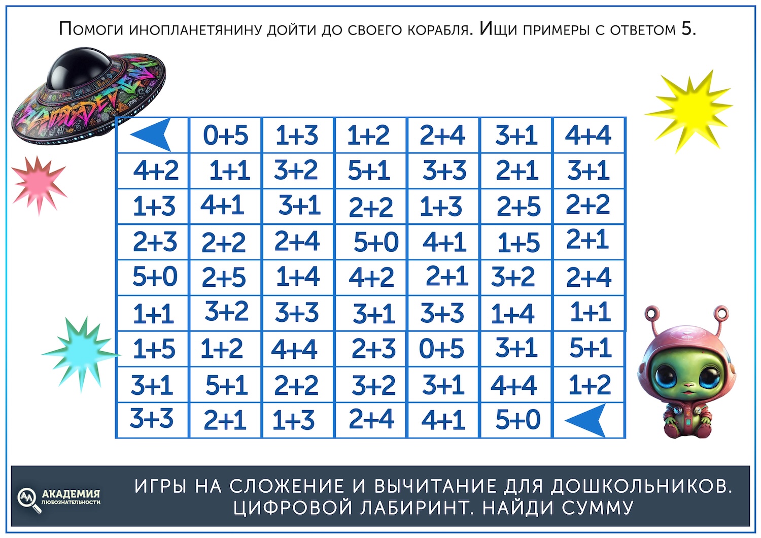 Когда простые лабиринты освоены, можно дать более сложные, на сложение. В них остается прежний принцип – нужно провести линию от старта до финиша, но при этом двигаться нужно не по последовательности чисел, а по ответу на пример. Скажем, нужно идти по клеткам с ответом, равным 5. Скачать их можно по ссылке ниже.