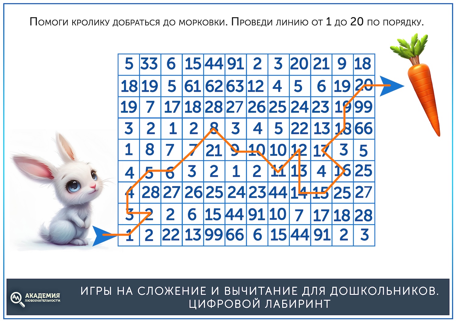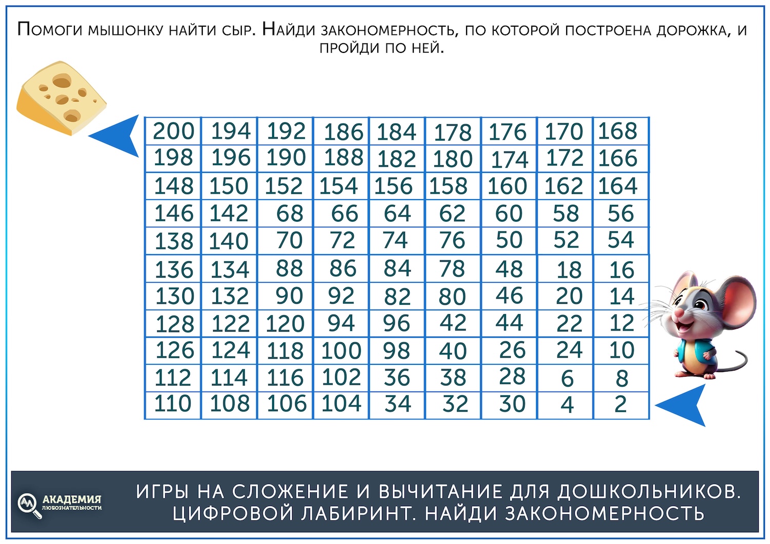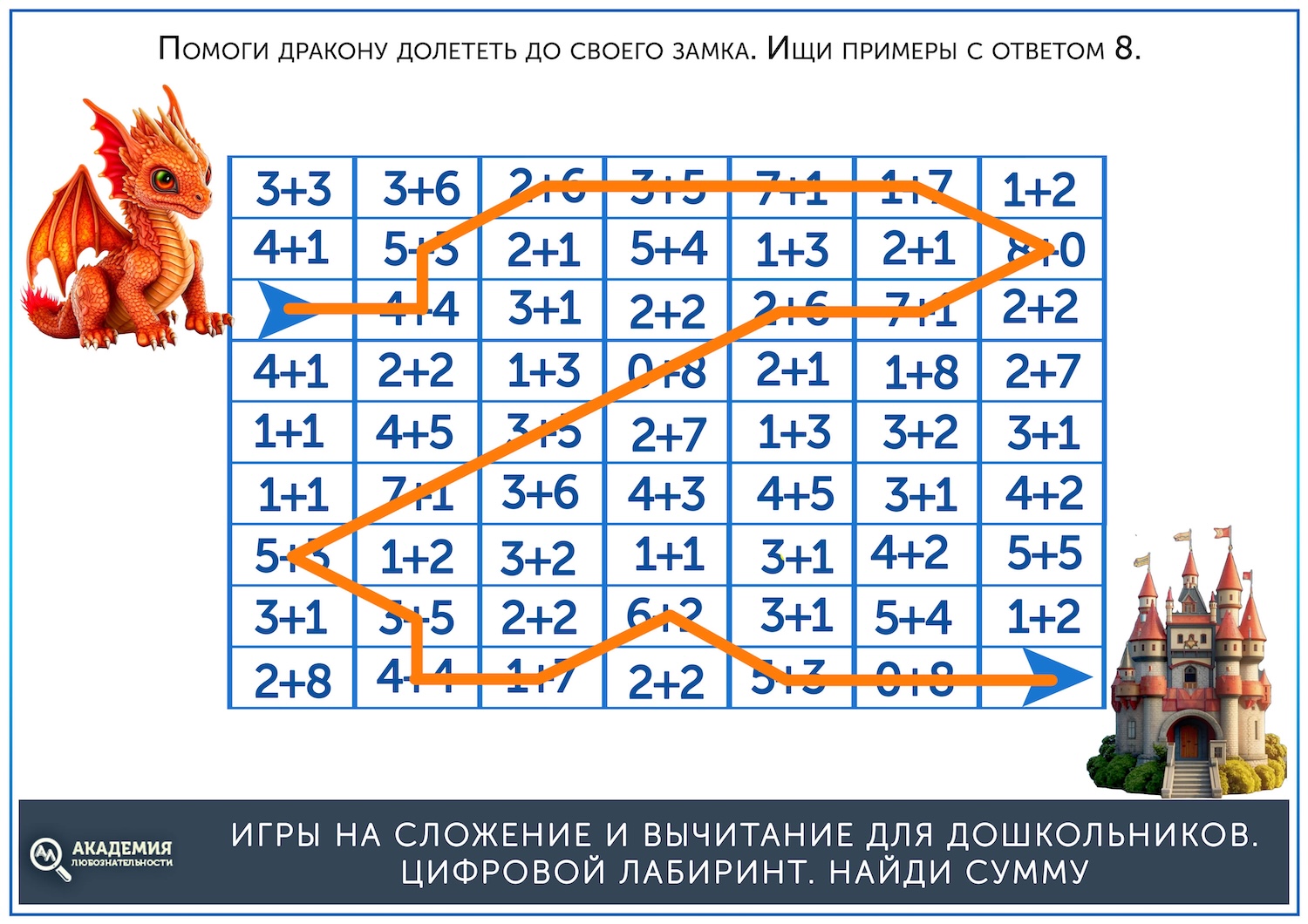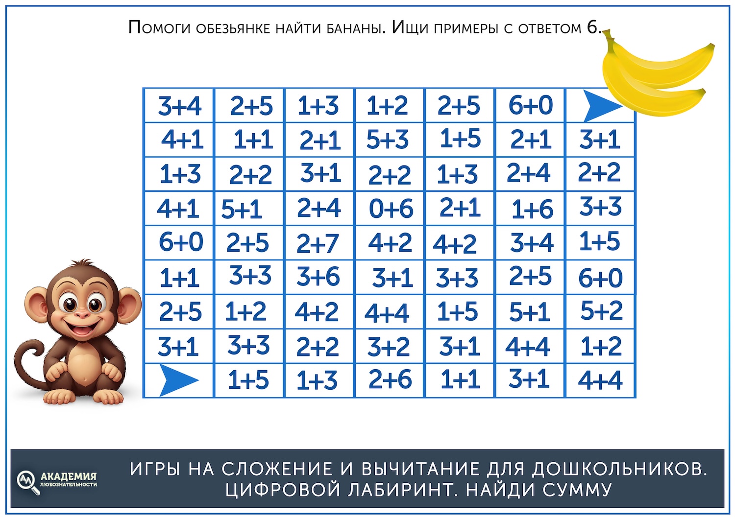 Когда простые лабиринты освоены, можно дать более сложные, на сложение. В них остается прежний принцип – нужно провести линию от старта до финиша, но при этом двигаться нужно не по последовательности чисел, а по ответу на пример. Скажем, нужно идти по клеткам с ответом, равным 5. Скачать их можно по ссылке ниже.