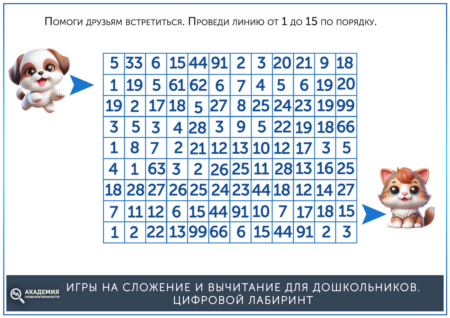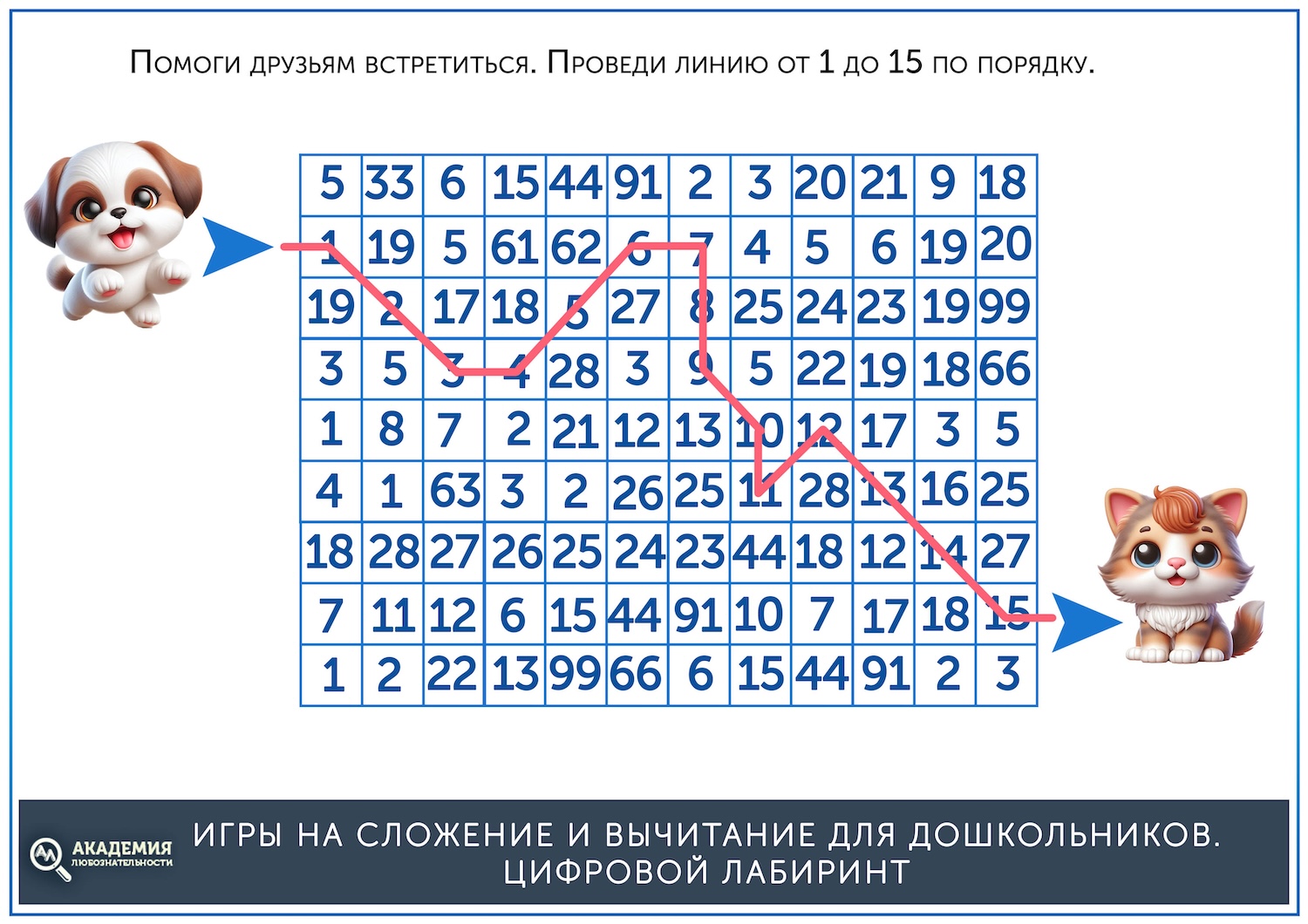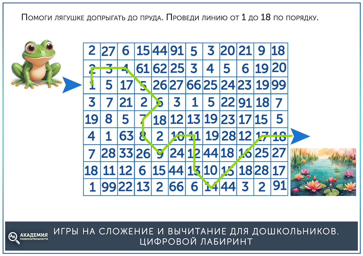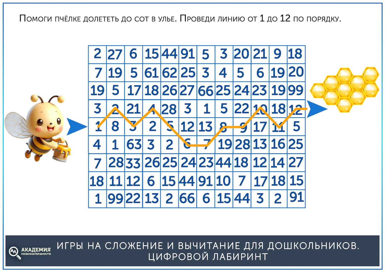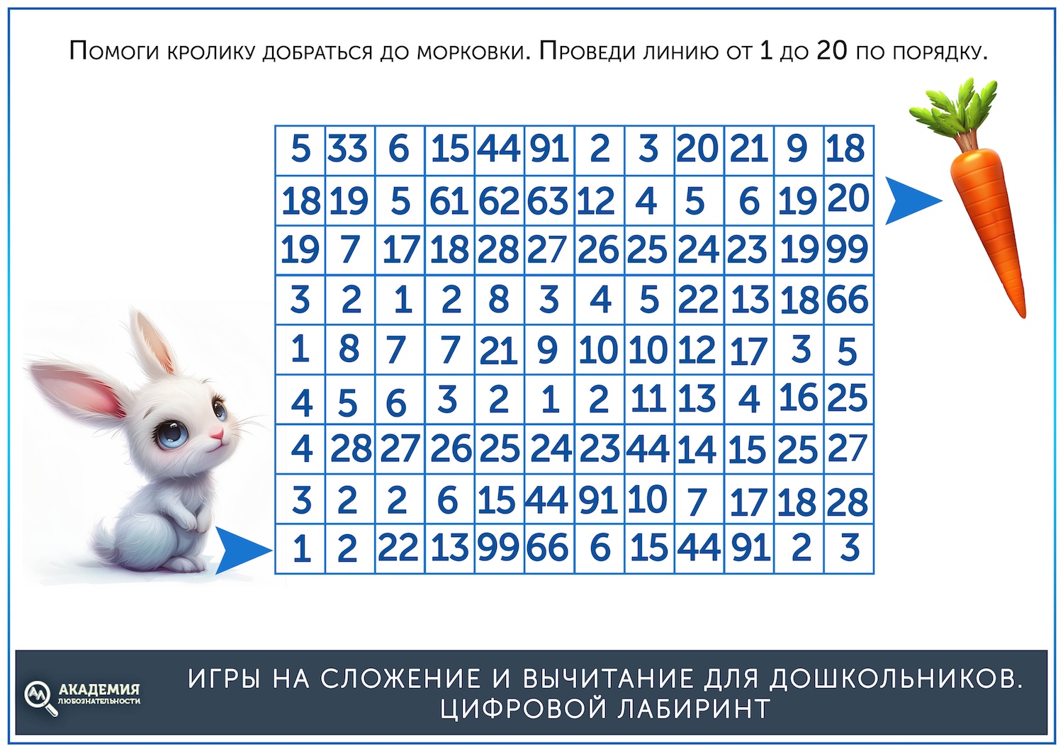 Когда простые лабиринты освоены, можно дать более сложные, на сложение. В них остается прежний принцип – нужно провести линию от старта до финиша, но при этом двигаться нужно не по последовательности чисел, а по ответу на пример. Скажем, нужно идти по клеткам с ответом, равным 5. Скачать их можно по ссылке ниже.
