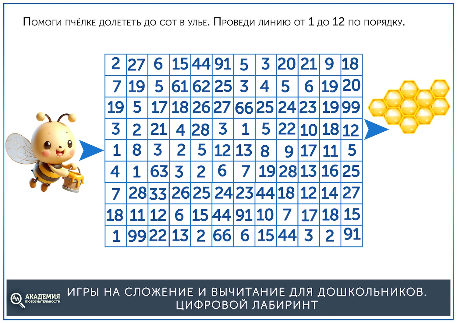 Это упражнение больше направлено на счет, чем на сложение. Но оно может подготовить ребёнка к более сложным заданиям, кроме того, цифровые лабиринты развивают внимательность. Распечатайте лабиринты и предложите малышу их пройти. Для этого ему нужно провести линию по цифрам от 1 до самого большого числа. Также укажите, что каждый раз к числу вы прибавляете единицу, например, 2+1=3, 3+1=4 и так далее. Скачать цифровые лабиринты можно по ссылке ниже.