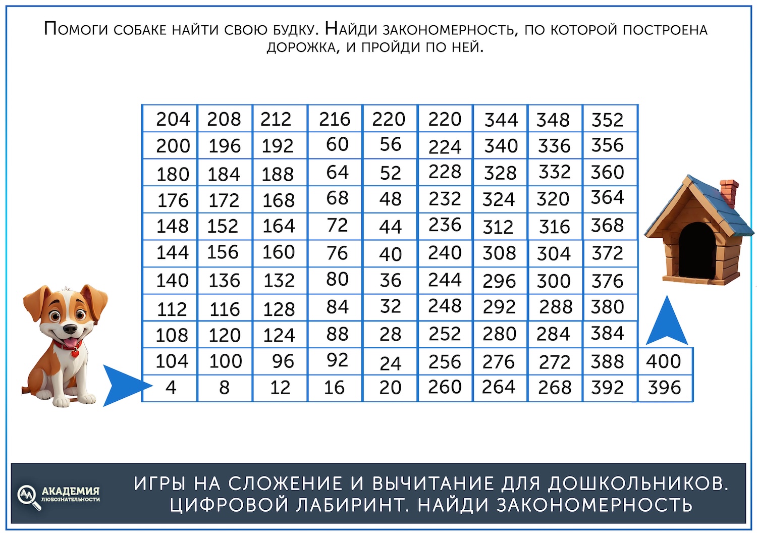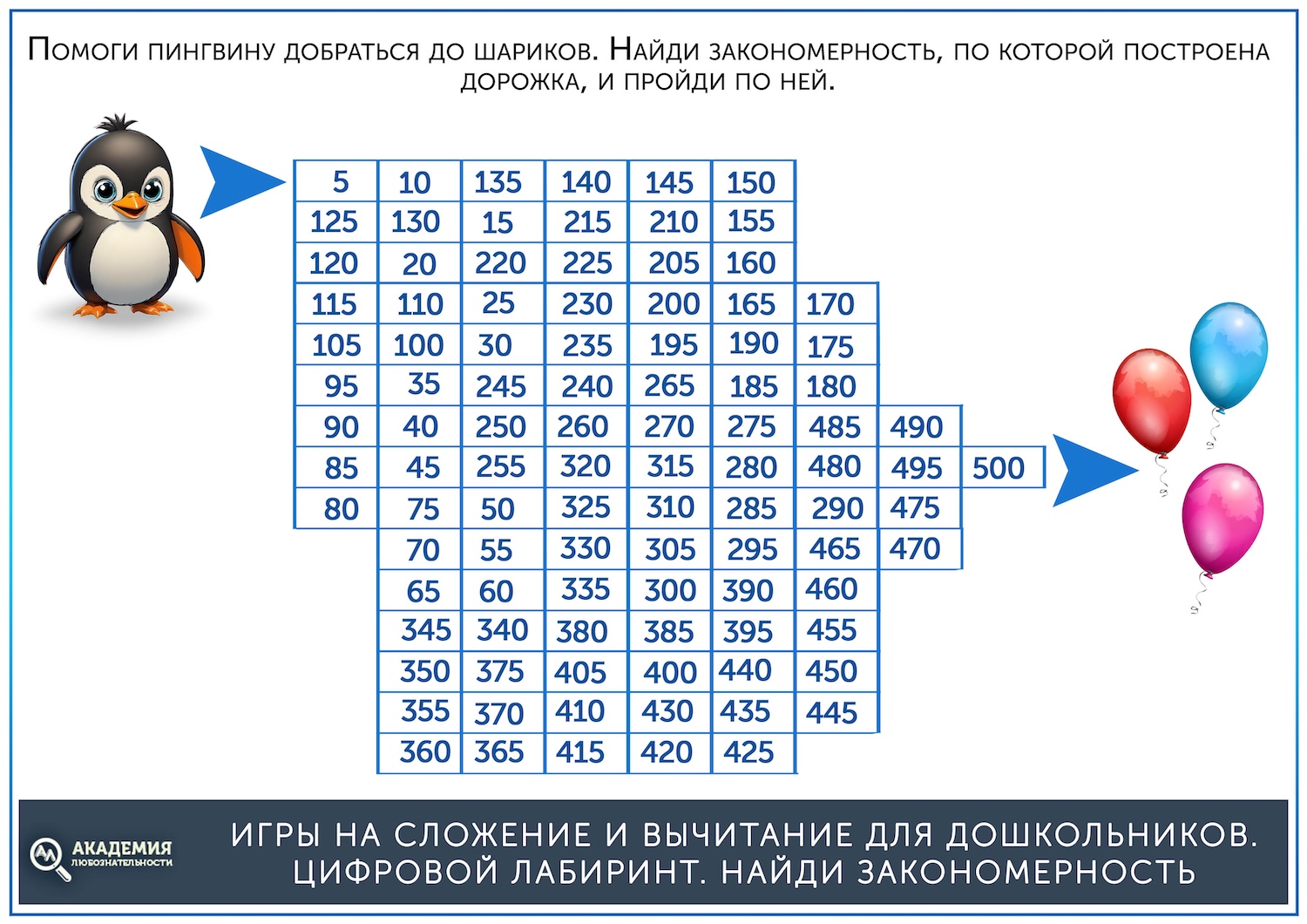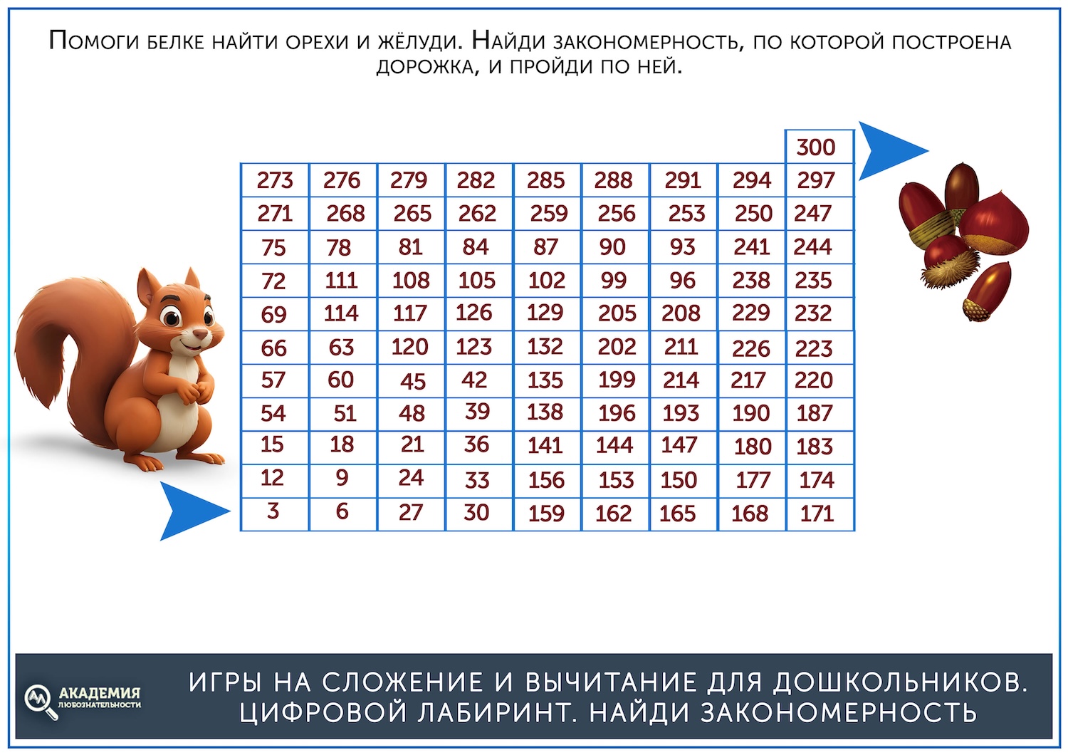 Другой вариант цифрового лабиринта на сложение требует сперва найти закономерность, а затем ей следовать. Например, всегда прибавлять 2 или 3. Если ребенок сам не может найти закономерность, подскажите ему, а складывать он будет сам. Они еще труднее, так как требуют устного счета, а к концу задания появляются двузначные и даже трехзначные числа, к которым нужно прибавлять неизменные 2 или 3. Вот несколько лабиринтов на сложение. Ссылка для скачивания ниже.