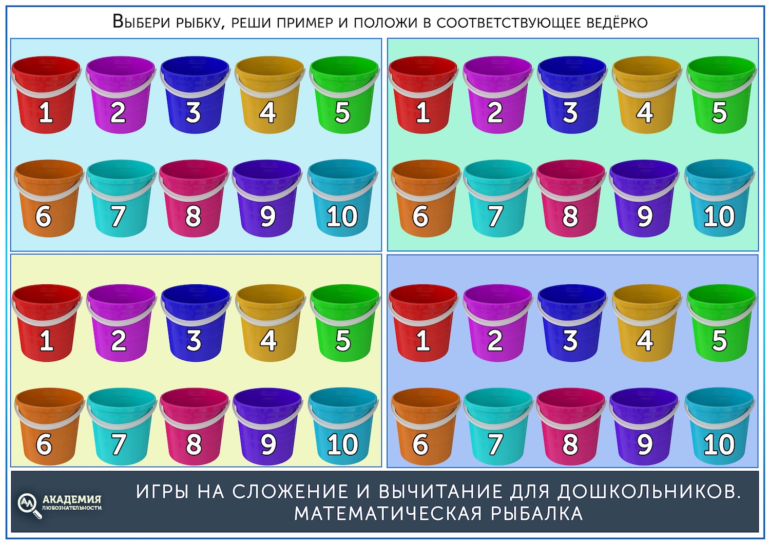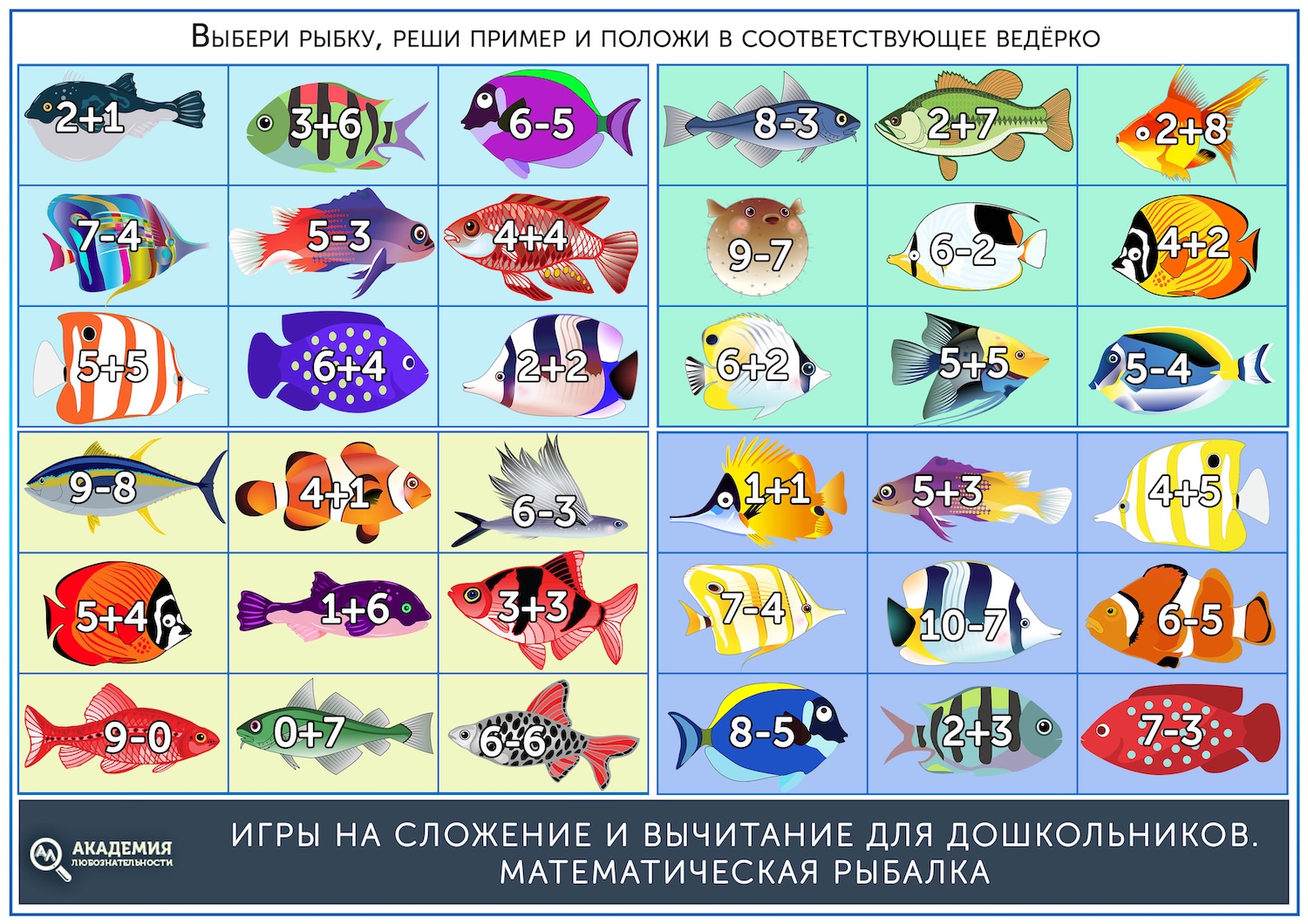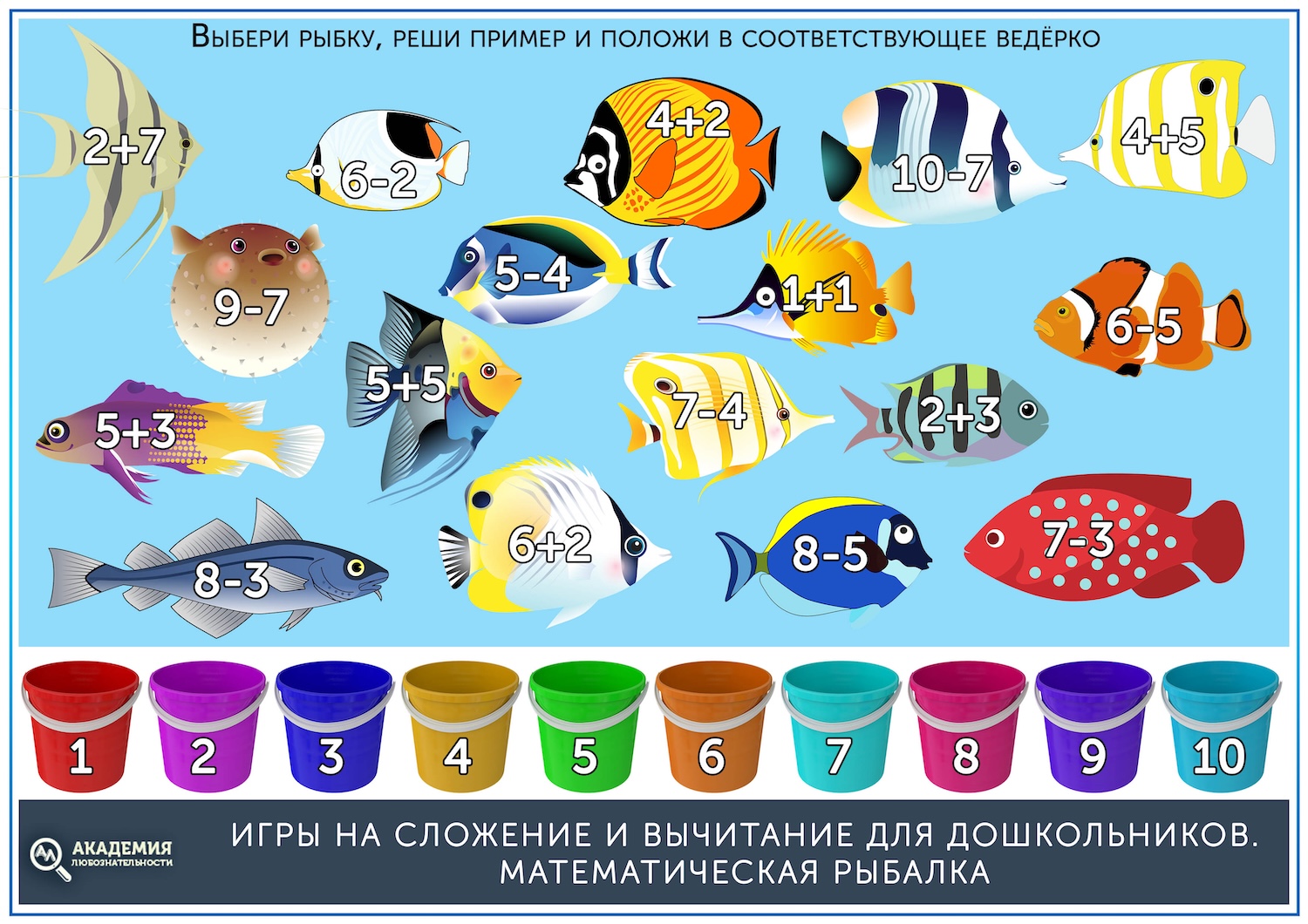 Распечатайте ведерки с цифрами и рыбок. На каждой рыбке напишите с обратной стороны примеры на сложение и вычитание в пределах 10.