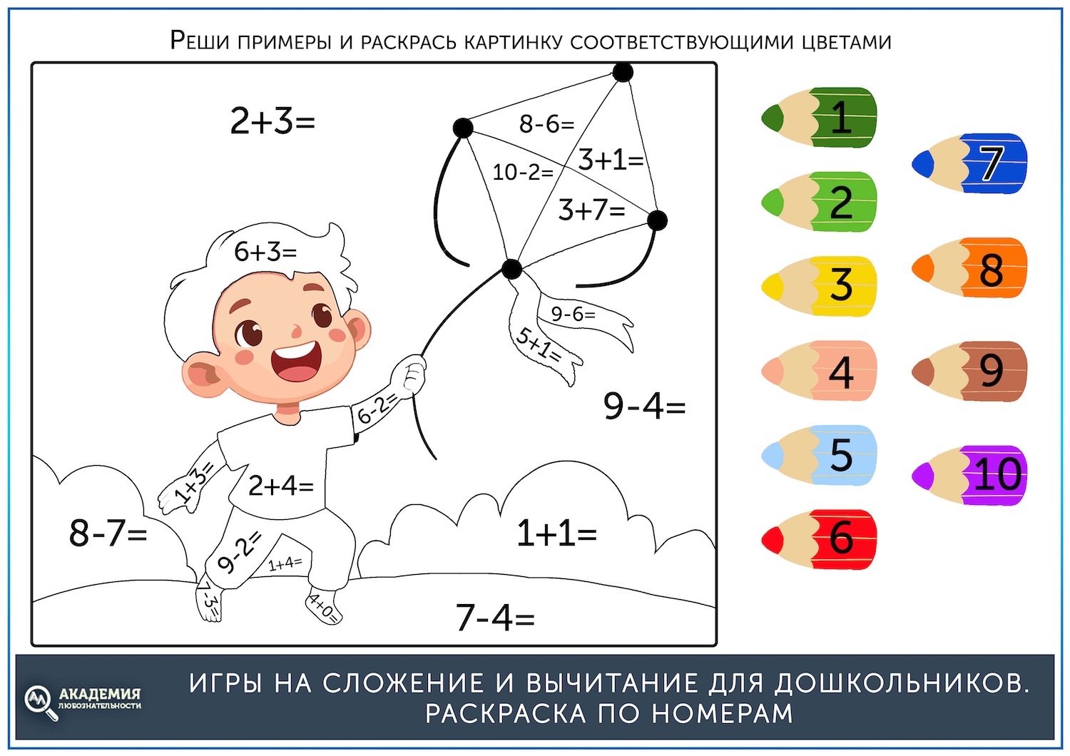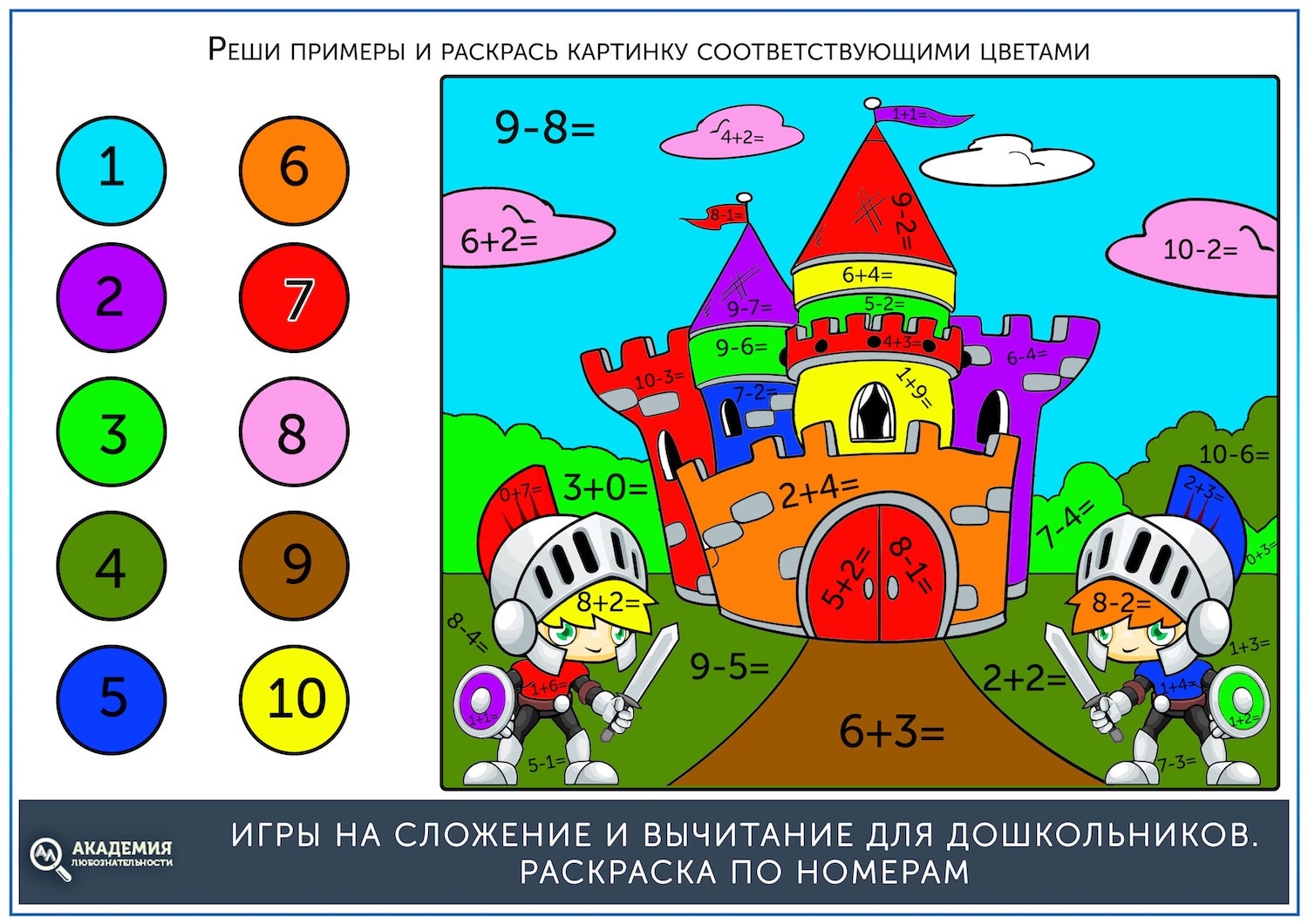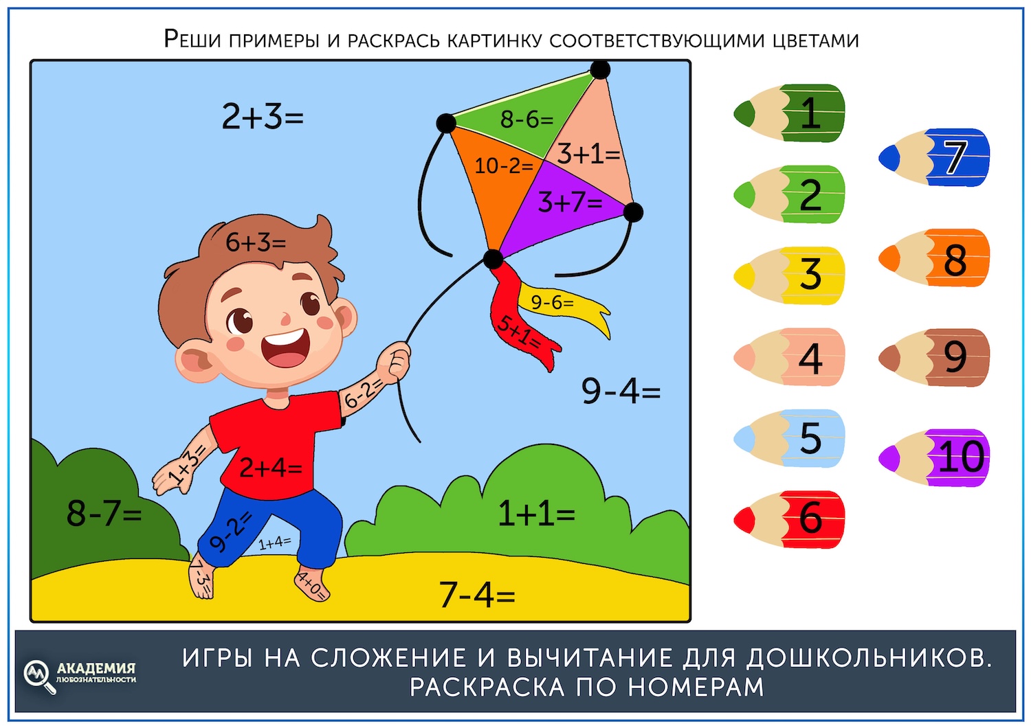 Если до этого ребенок уже раскрашивал картинки по номерам, то задание будет ему понятно. Нужно решать примеры и раскрашивать картинку тем цветом, который соответствует цифре в ответе.