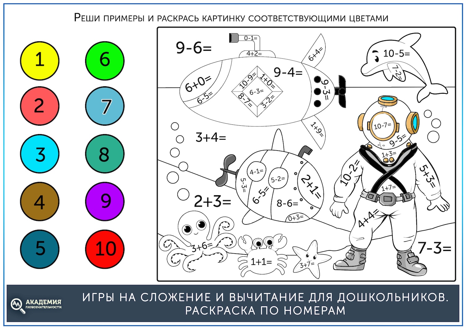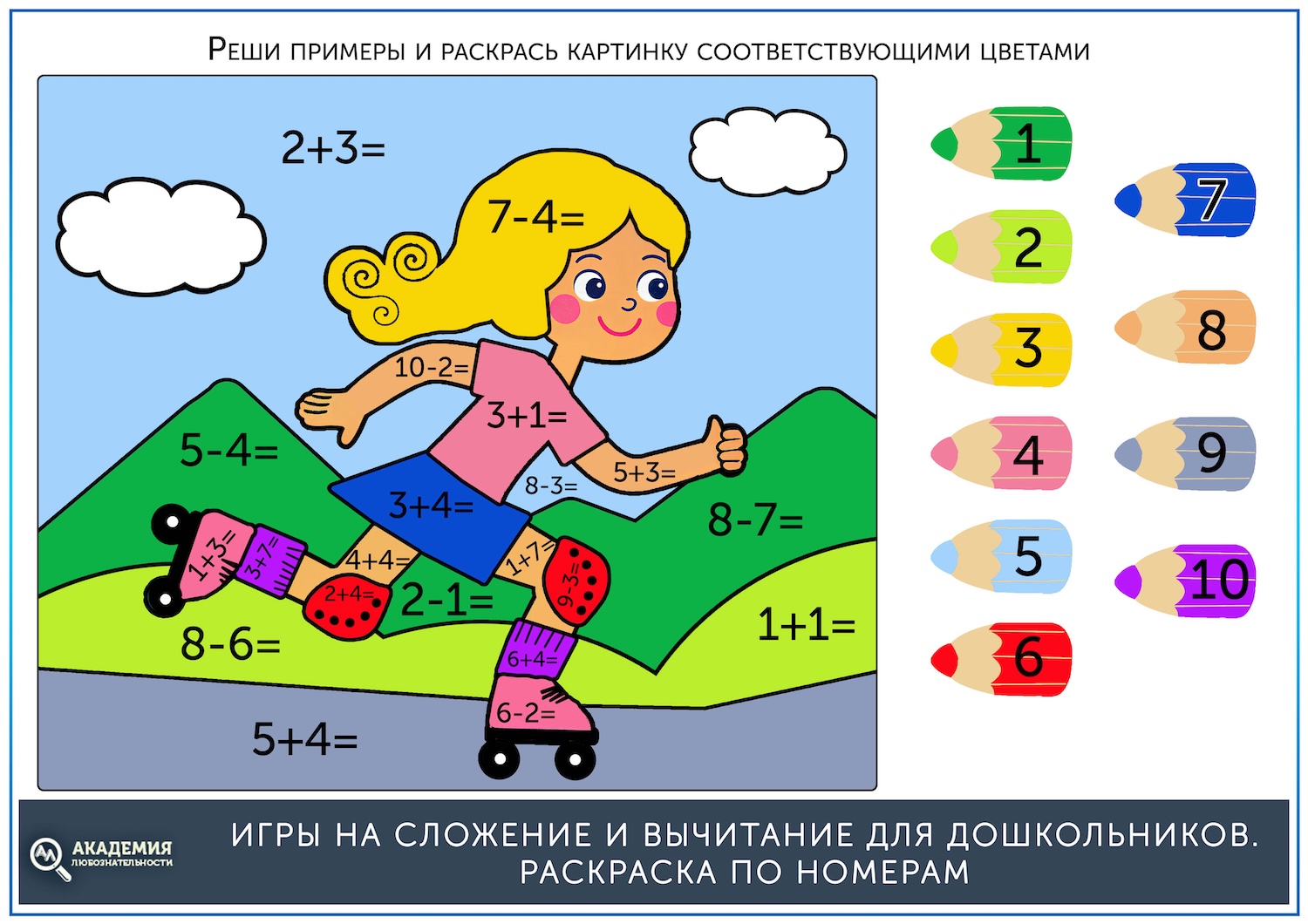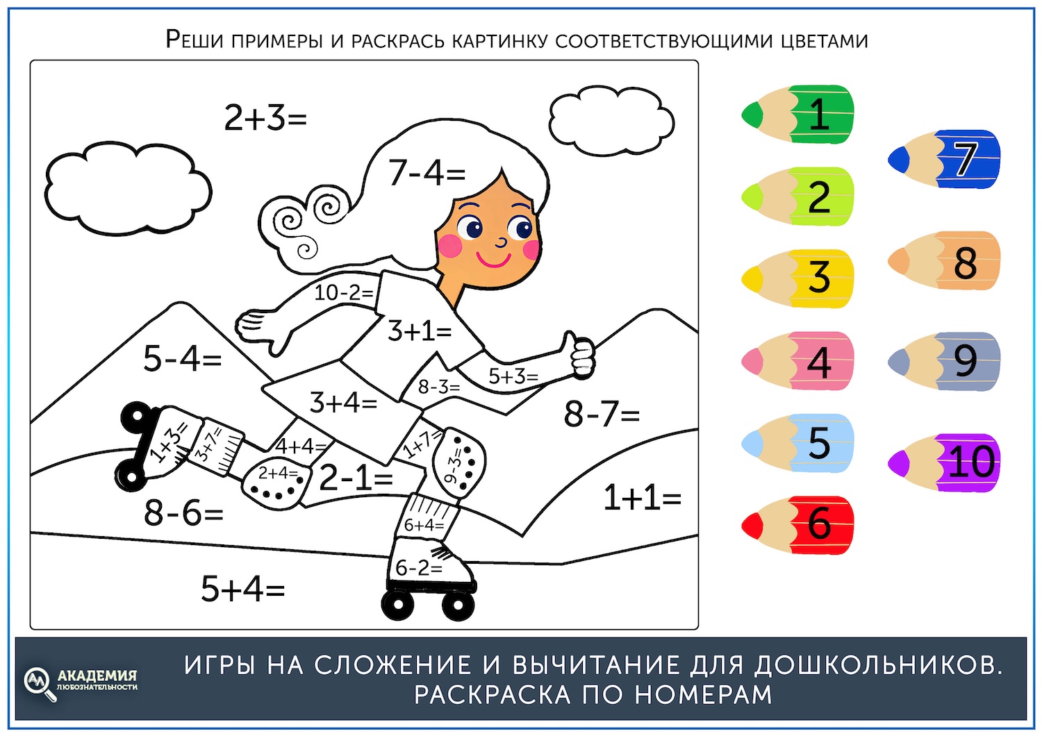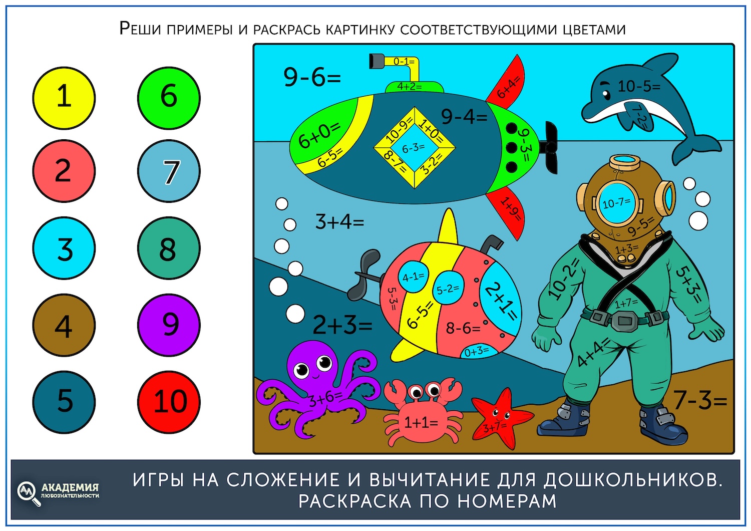 Если до этого ребенок уже раскрашивал картинки по номерам, то задание будет ему понятно. Нужно решать примеры и раскрашивать картинку тем цветом, который соответствует цифре в ответе.