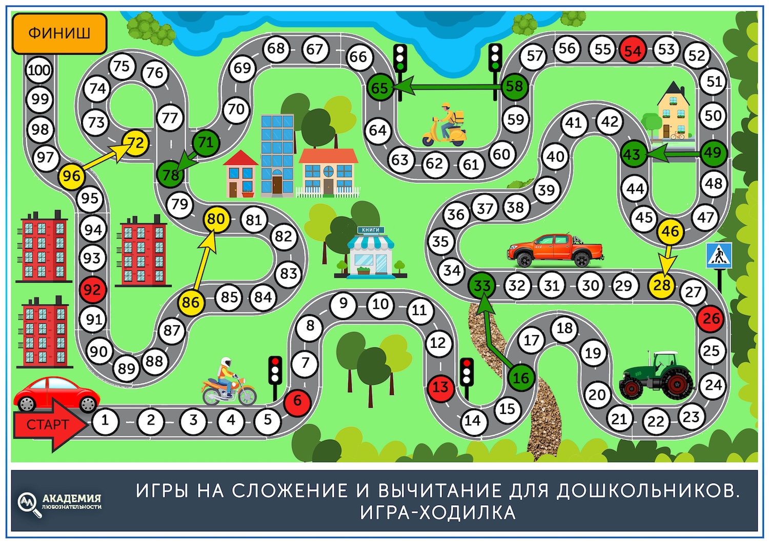 Ходилки – одни из первых настольных игр, с которыми знакомится ребёнок. Они имеют простой сюжет, соревновательный момент и учат работать с игральными кубиками, а значит, складывать их результат. Не обязательно покупать игровое поле, можно распечатать несколько из интернета и часто их менять, это поддержит интерес ребёнка. Вот примеры игровых полей для ходилок. Скачать их можно по этой ссылке: