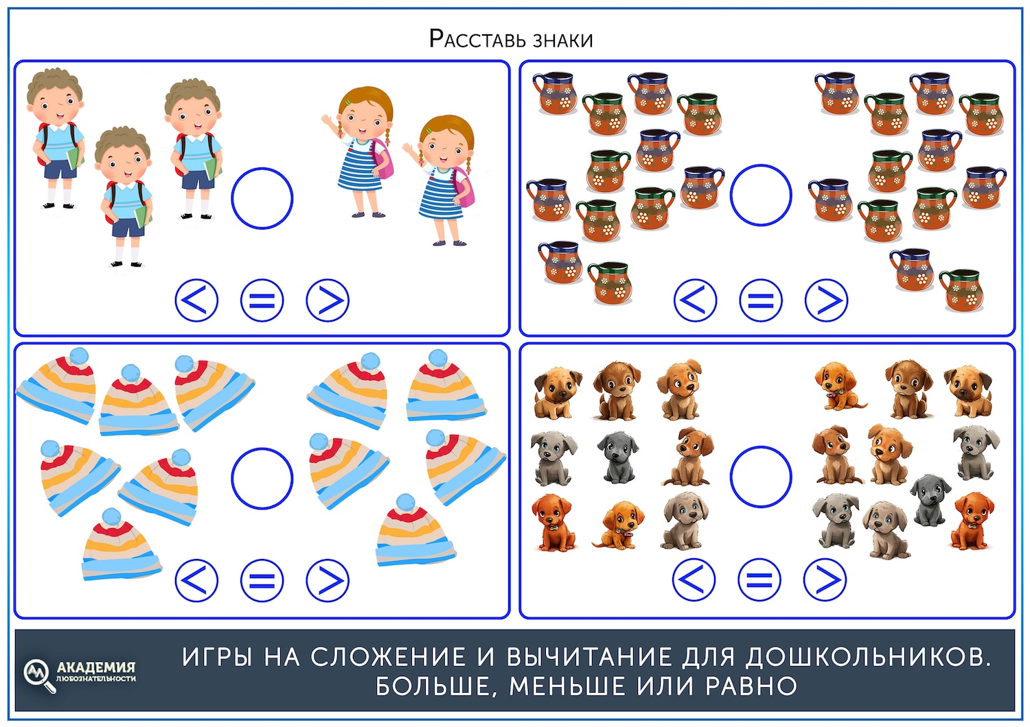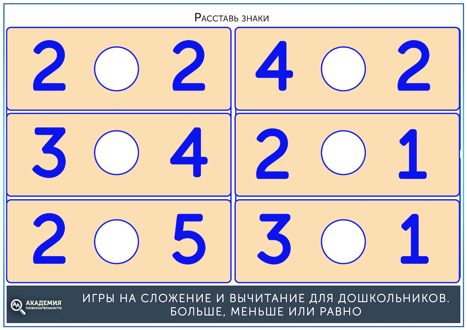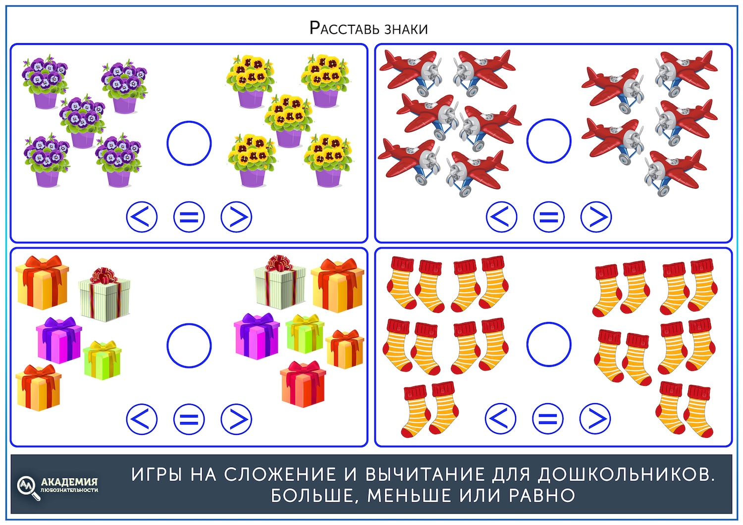 Конечно, сложением и вычитанием математика для дошкольника не ограничивается. К 4 годам пора вводить понятия больше, меньше или равно. Как и в примерах, сперва стоит начать со сравнения картинок, а затем перейти к цифрам. Скачать шаблоны для занятий можно по ссылке ниже.