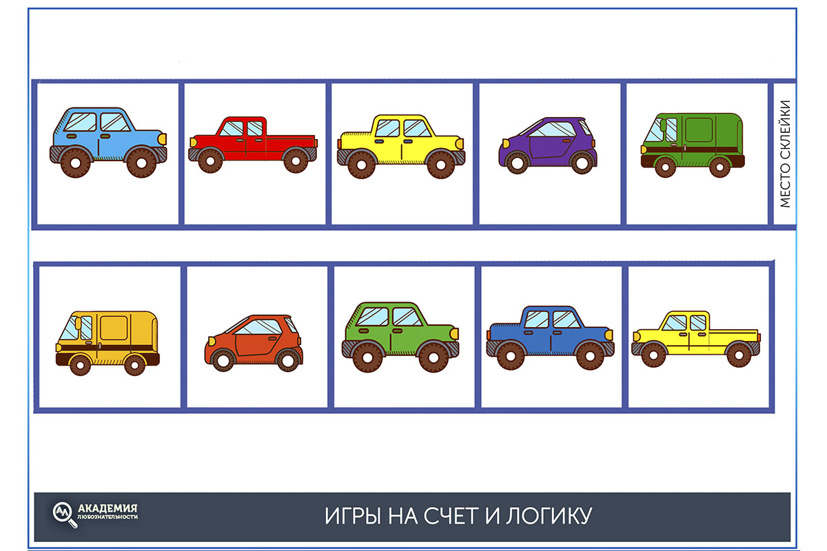 После поупражняйтесь в счёте. На каком месте стоит синяя машинка? А которая по счёту зелёная? Посчитайте место машинки слева направо, а затем справа налево. Отличается ли результат? Ребёнок должен прийти к выводу, что порядковый счёт зависит от того, в каком направлении мы считаем. А если таким же образом подсчитать общее количество автомобилей, то число не изменится.