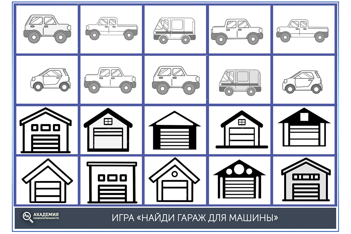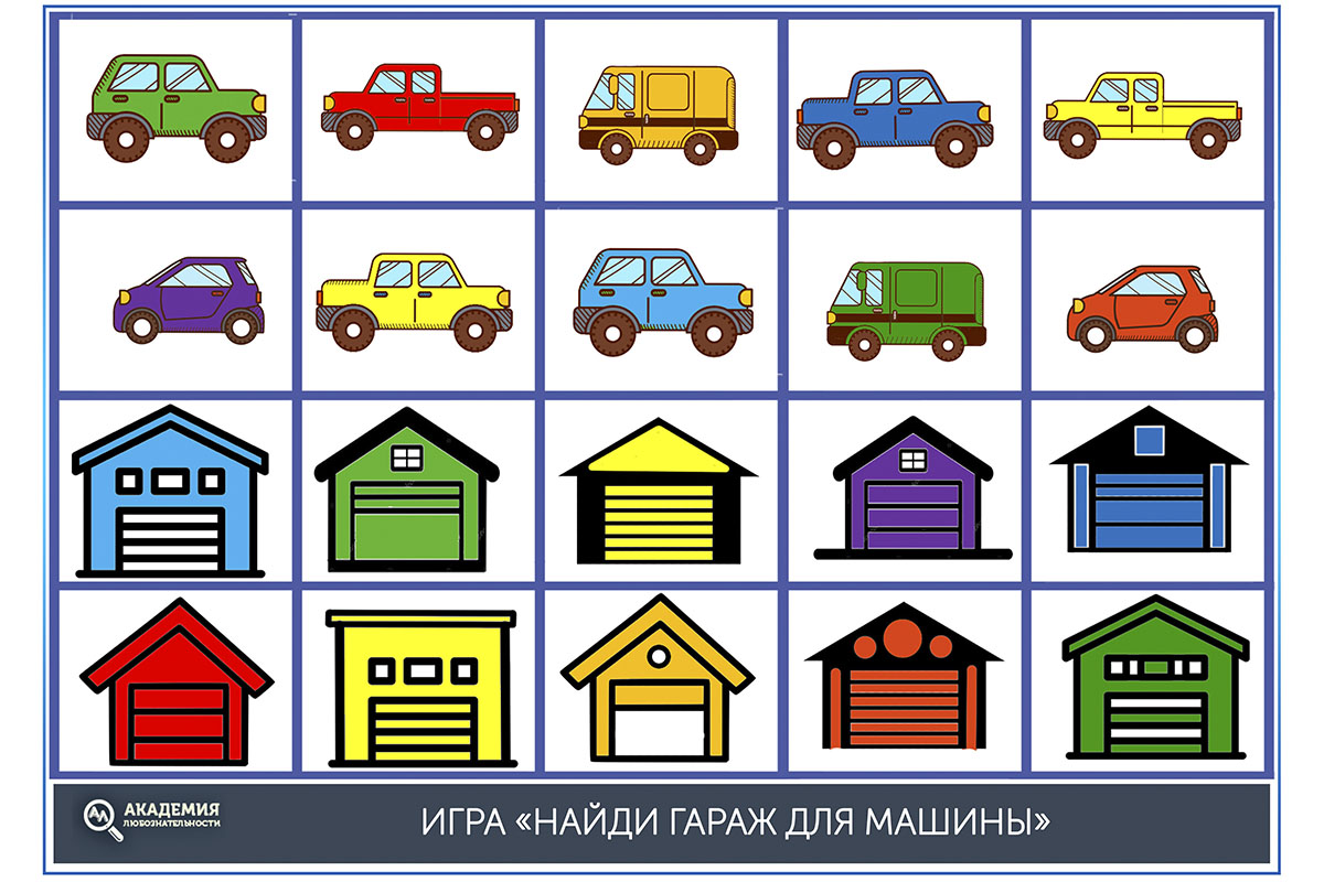После можно изменить задание. Уменьшите или увеличьте количество карточек в ряду. Спросите ребёнка, у всех ли машинок есть гараж? Чего больше или меньше? Как сделать равное количество автомобилей и гаражей?