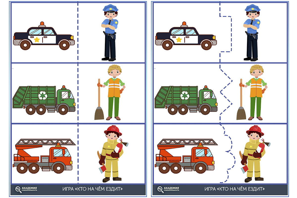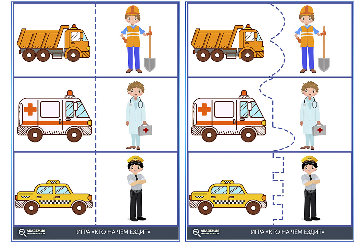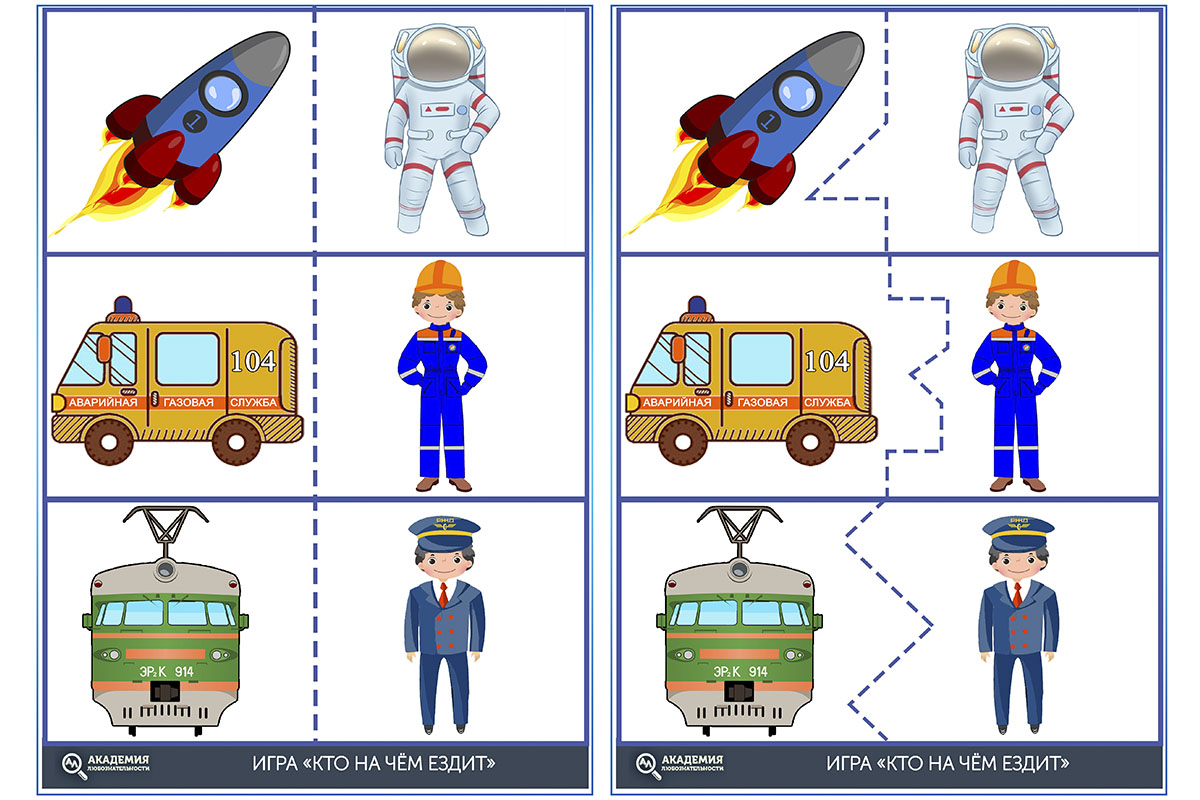 Полезное задание для ребят, чтобы не только повторить виды транспорта, но и вспомнить соответствующие профессии. Покажите ребёнку карточку полицейской машины и попросите подобрать для неё водителя и назвать его. Кто это? Правильно, полицейский. А кто летает на космическом корабле? Космонавт. А за рулём такси сидит таксист.