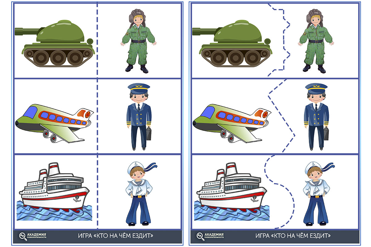 Задание тренирует зрительную память и внимание. Для игры потребуются карточки с машинами. Только на этот раз они должны быть парными. Изображения раскладываются картинками вниз. За один ход можно открывать по две карточки. Если они оказываются одинаковыми, то игрок забирает их себе. В случае если картинки разные, то они кладутся обратно изображениями вниз. Кто соберёт больше всех парных карточек, тот и выигрывает. Во время игры участники стараются запомнить, где какая картинка прячется, чтобы при следующем своём ходе открыть нужные парные изображения. Для игры вы можете распечатать по две карточки из задания с видами транспорта, которые были даны выше.